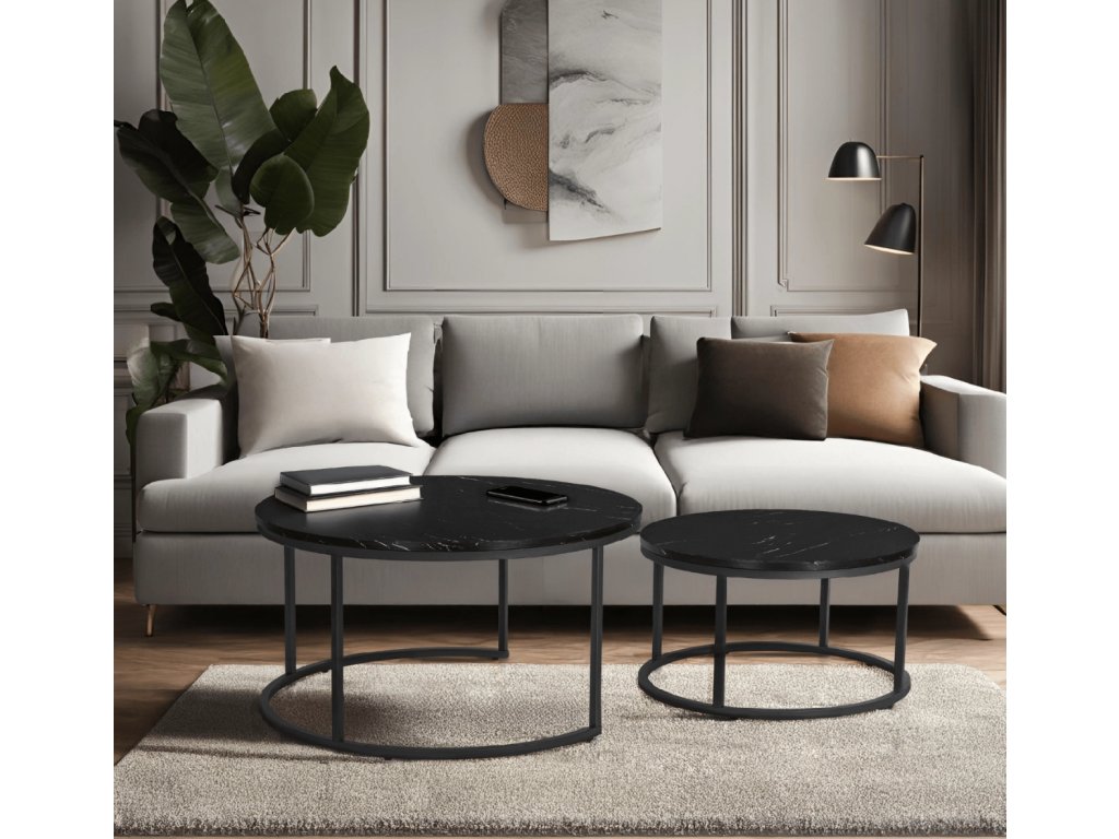 A 2 darabos Mauro Maxi dohányzóasztal szett a modern dizájnt, a praktikus használatot és a minőségi kivitelezést ötvözi. Az ellenálló konstrukció és az elegáns fekete márvány asztallap luxus hatást kelt, és bármely belső térbe illik. Az elhelyezés rugalmassága és az egyszerű karbantartás ideális választássá teszi azoknak a háztartásoknak, akik stílust, funkcionalitást és kényelmet keresnek egyben.
