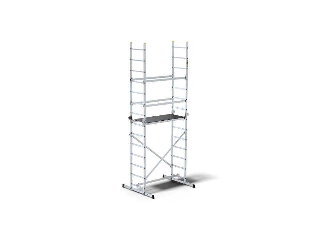 A platform felülete csúszásmentes, vízálló rétegelt lemezből készült. Ezenkívül a platform egy csapóajtóval van felszerelve, amely megkönnyíti az állvány belépését és kilépését. A kiegészítő oldalsó panelek megakadályozzák, hogy a munka során használt szerszámok leessenek a magasból. Az állvány stabilizátora műanyag görgőkkel van felszerelve, amelyek jelentősen megkönnyítik az állvány szállítását munka közben. Még csúszó is, így tetszőleges távolságot állíthat be az állvány és a fal között, hogy nagyobb kényelmet biztosítson a munkavégzés során. Az állvány szerkezete és minden létrás konfigurációja teljes mértékben megfelel az EN 131 európai biztonsági és tartóssági szabványnak.