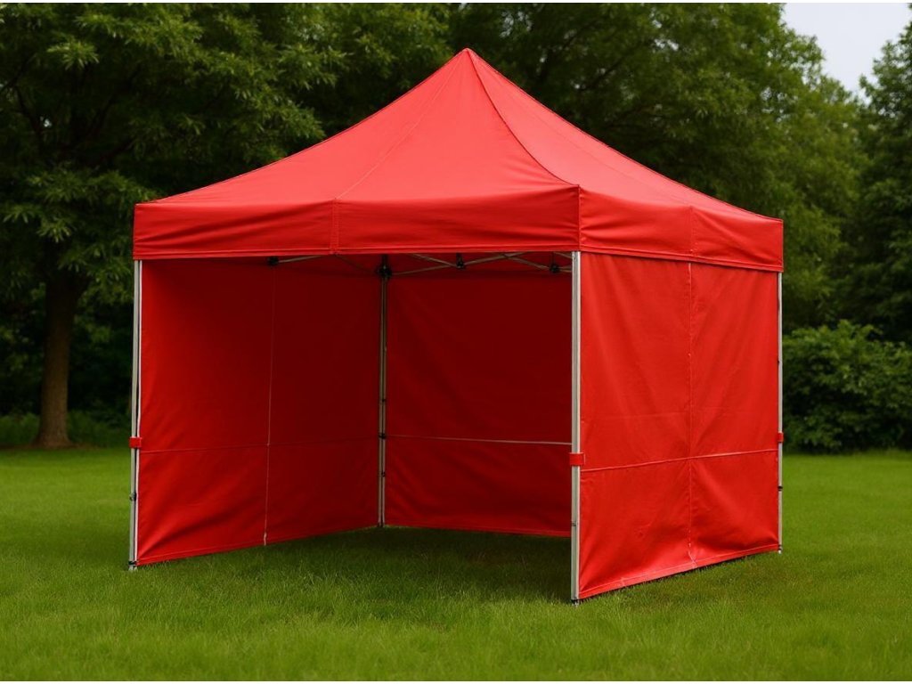 Piros színű ollós sátor 3 x 3 m, súly: 28 kg, állítható magasság 190-től 220 cm-ig, alumínium szerkezet, stabil hatszögletű láb, vízálló tető 820D (400 g/m²), oldalfalak 420D (165 g/m², 3 darab), összecsukott sátor méretei: 160 x 25 x 25 cm