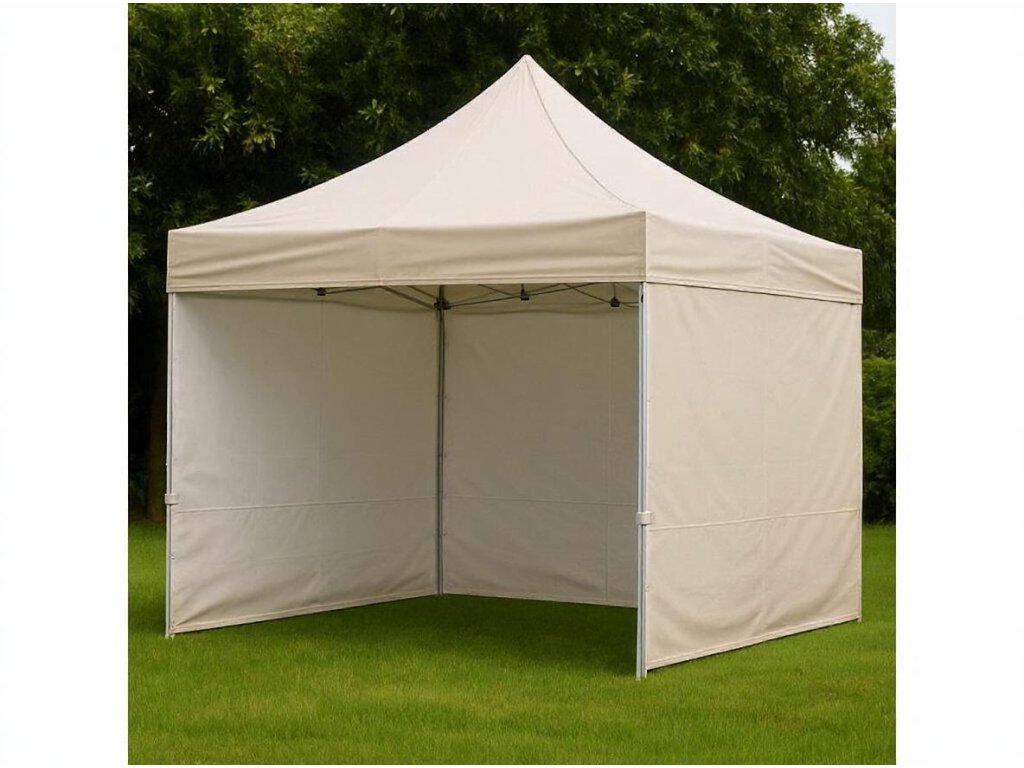 Beige színű ollós sátor 3 x 3 m, súly: 28 kg, állítható magasság 190-től 220 cm-ig, alumínium szerkezet, stabil hatszögletű láb, vízálló tető 820D (400 g/m²), oldalfalak 420D (165 g/m², 3 darab), összecsukott sátor méretei: 160 x 25 x 25 cm