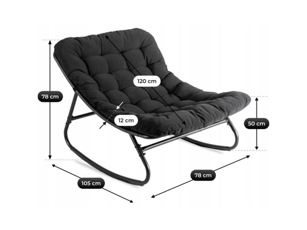Az Aurora hintafotel minőségi anyagokból készült, az ülőfelület vízálló, elegáns fekete színű szövettel borított, így ellenáll az esőnek és a véletlen italömlésnek. A stabil szerkezetet porfestett fémváz biztosítja, amely véd a korrózió és a nedvesség ellen.