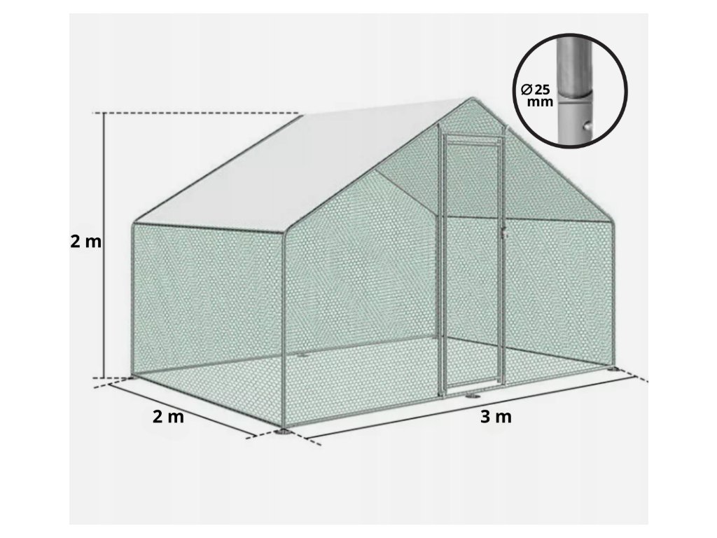 A 3 × 2 m-es tágas alapterület és a 2 m-es magasság elegendő helyet biztosít a szabad mozgáshoz, támogatva az állatok fizikai aktivitását és általános jóllétét. A ponyva megakadályozza a túlmelegedést, és egész évben kellemes belső körülményeket teremt. A kifutó nemcsak csirkéknek, hanem nyulaknak, kacsáknak és más kisállatoknak is ideális.