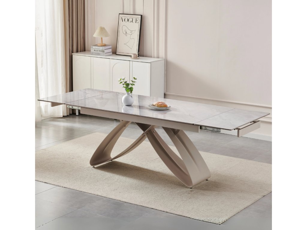 Az asztallap kerámiából készült, fehér márvány hatású, amely rendkívül ellenáll a karcolásnak, nedvességnek és hőnek. Az elegáns felület könnyen tisztítható. A kashmír színű acélszerkezet stabilitást és modern megjelenést biztosít.