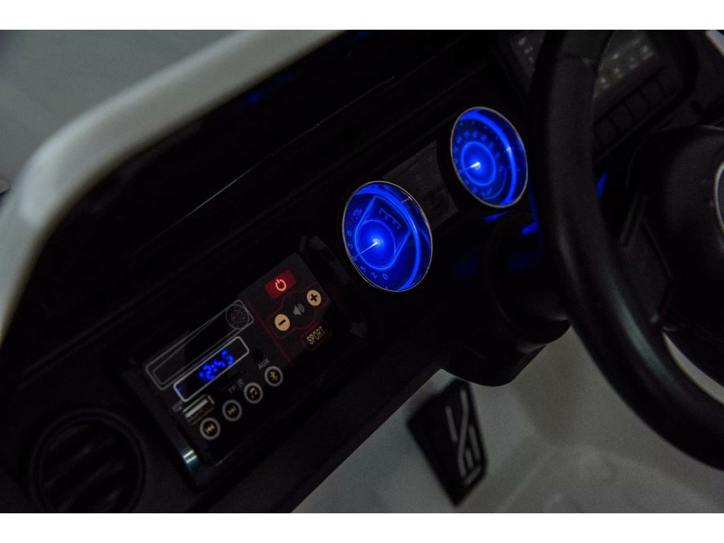Az USB-bemenettel ellátott MP3-lejátszó, a kormánykeréken megjelenő valósághű hangok, az első és hátsó LED-fények és a nyomógombos indítás igazi élménnyé teszik a vezetést.