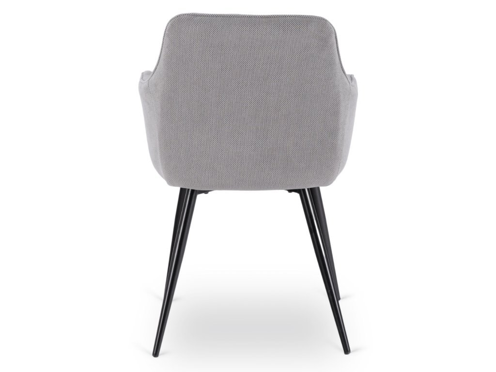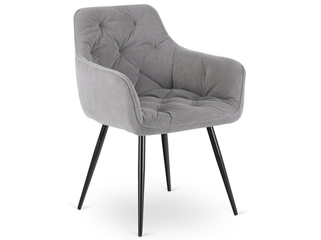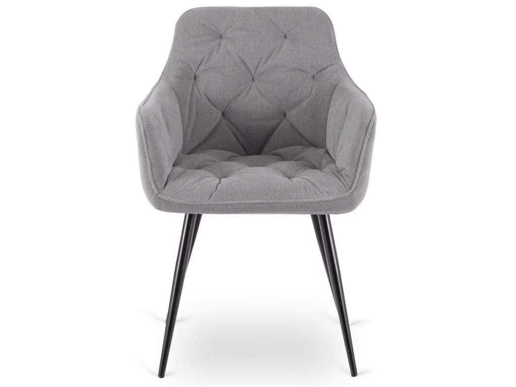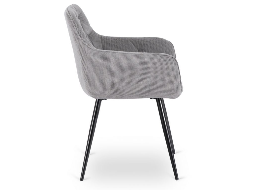 A szék puha szürke szövetborítást kapott, amely kellemes tapintású és ellenáll a mindennapi használatnak. A stabil szerkezetet porfestett fém lábak egészítik ki, modern megjelenést és masszív tartást biztosítva.