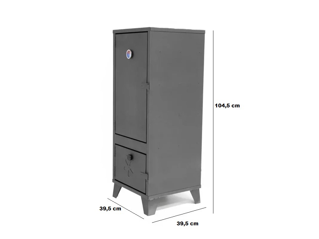 A füstölő szerkezete 1,2 mm vastag acéllemezből készül, amely megfelelő stabilitást és egyenletes hőeloszlást biztosít a füstölés során. A 104,5 cm-es magasság kényelmes kezelést tesz lehetővé, míg a 39,5 cm-es szélesség és mélység elegendő belső teret kínál különböző alapanyagok számára. A 37 × 35 cm-es rács alkalmas többféle élelmiszer egyidejű füstölésére.