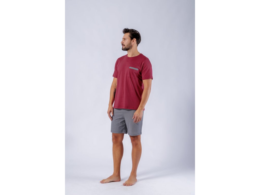 - szín: bordó póló, szürke csíkos rövidnadrág