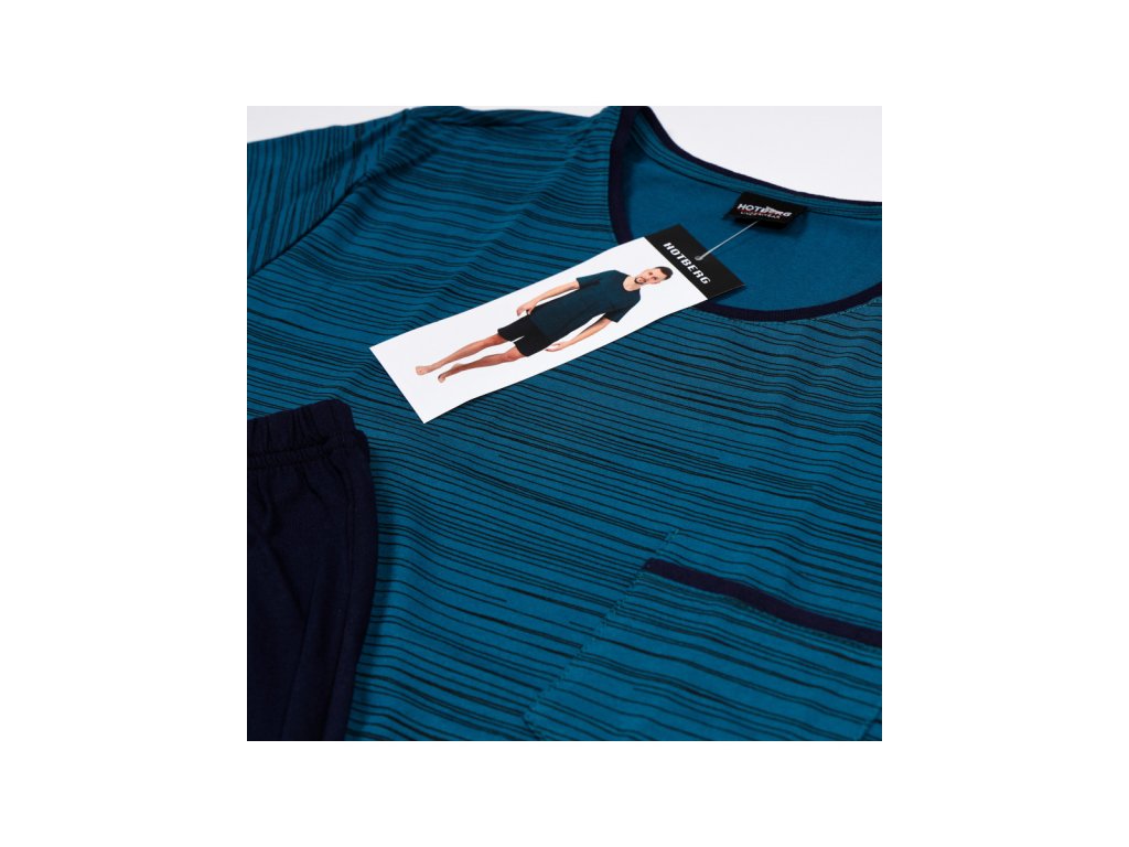 A szett egy rövid ujjú, finom mintával ellátott pólóból áll, amelyet egy egyszínű, elasztikus derékszíjjal ellátott rövidnadrág alja egészít ki. A pizsama lazább szabású, ami kényelmet biztosít alváskor és otthoni pihenéskor.