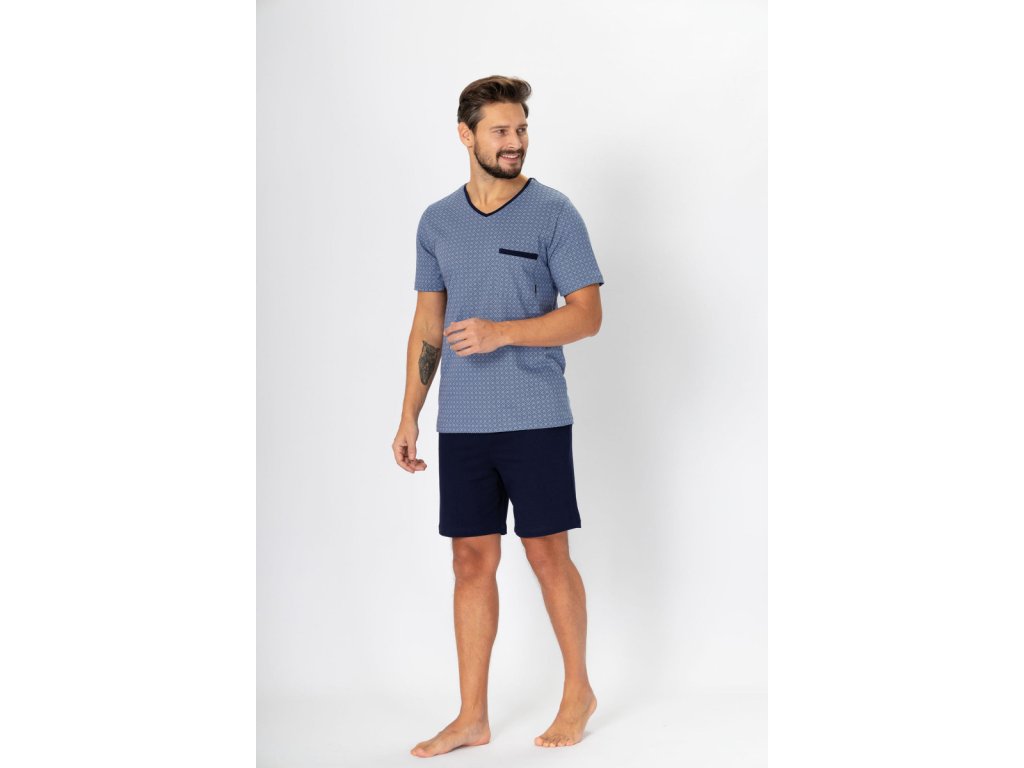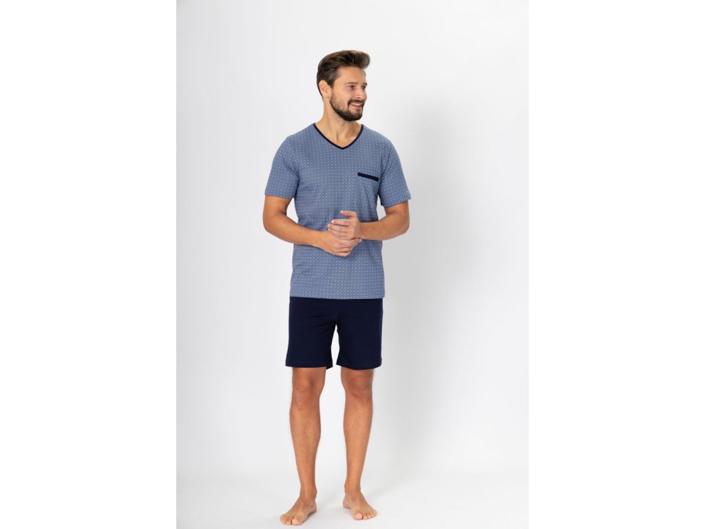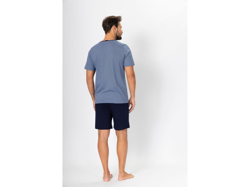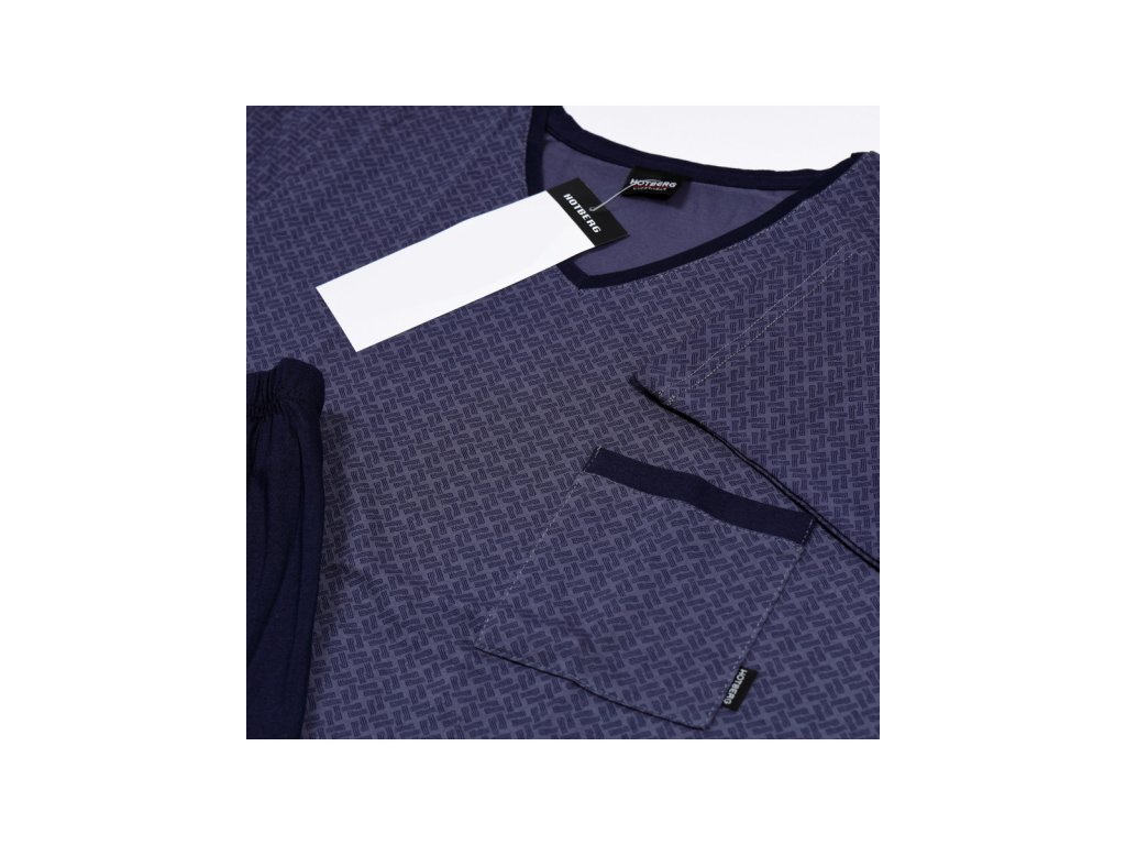 A férfi kék Carl pizsama egy rövid ujjú pólóból áll, amely finom geometriai mintával van ellátva, és amelyet egy finom kontrasztos zseb egészít ki. Az egyszínű, rövid nadrág elasztikus derékszíjjal tökéletesen kiegészíti a felsőt, és garantálja a mozgás szabadságát. Akár otthon pihensz, akár lefekvéshez készülődsz, ebben a pizsamában kényelmesen fogod érezni magad.