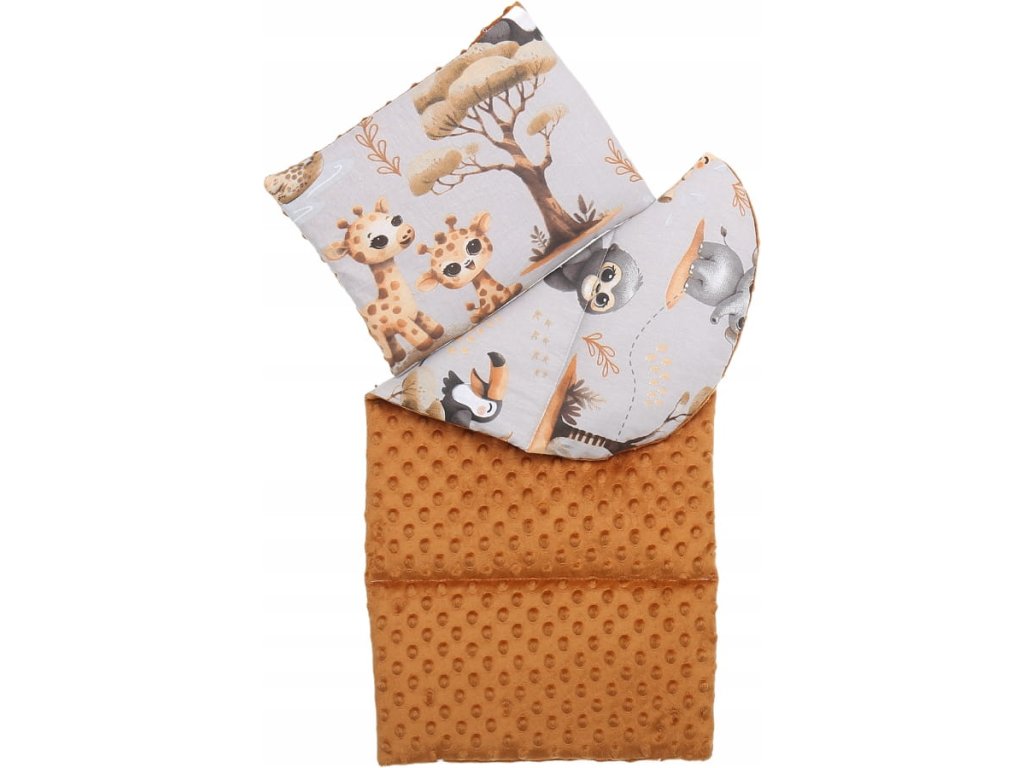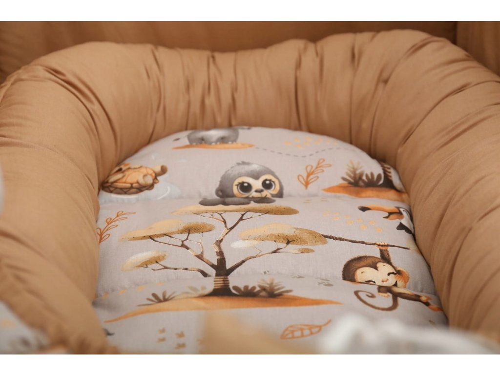 Gyermekágy szett, 7 db, minta: állatok a dzsungelben, szín: szürke, fahéj, anyag: pamut, nerc, csomagban: fészek, ütéscsillapító párna, takaró, matrac, lapos párna, kendő, pamut huzat, mosógépben mosható 40°C-on.