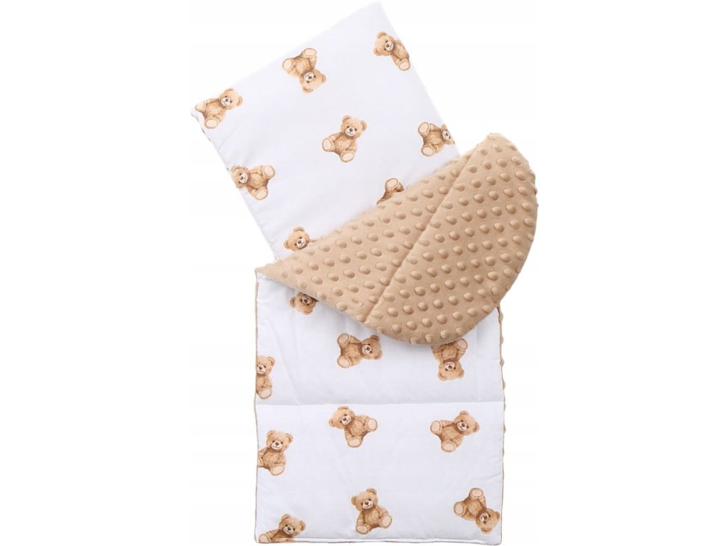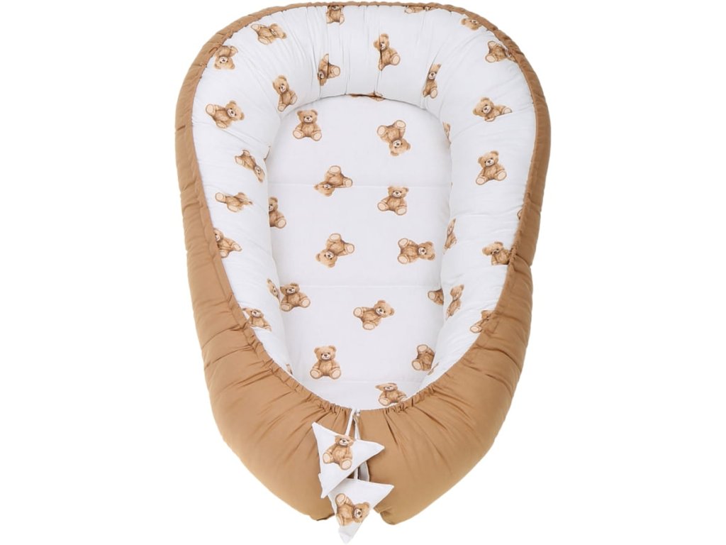 Gyermekágy szett, 7 db, minta: mackó, szín: fehér, barna, anyag: pamut, nerc, csomagban: fészek, ütéscsillapító párna, takaró, matrac, lapos párna, kendő, pamut huzat, mosógépben mosható 40°C-on.