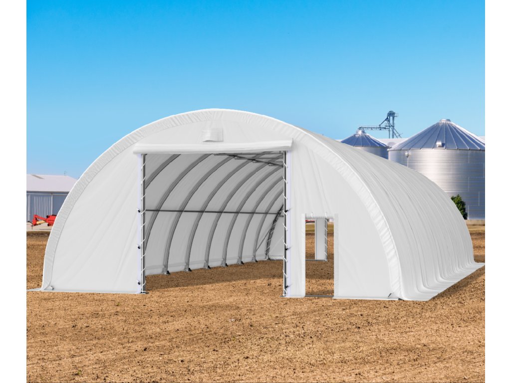 A szerelt íves csarnok praktikus megoldás áruk, technikai eszközök, alapanyagok vagy mezőgazdasági termékek tárolására. A stabil acélszerkezet és a vastag PVC ponyva biztosítja a stabilitást zord körülmények között is, védelmet nyújtva az eső, a szél, az UV-sugárzás és a por ellen. A csarnok alkalmas az egész éves használatra, körülbelül -15 °C és +45 °C közötti hőmérsékleti tartományban.
