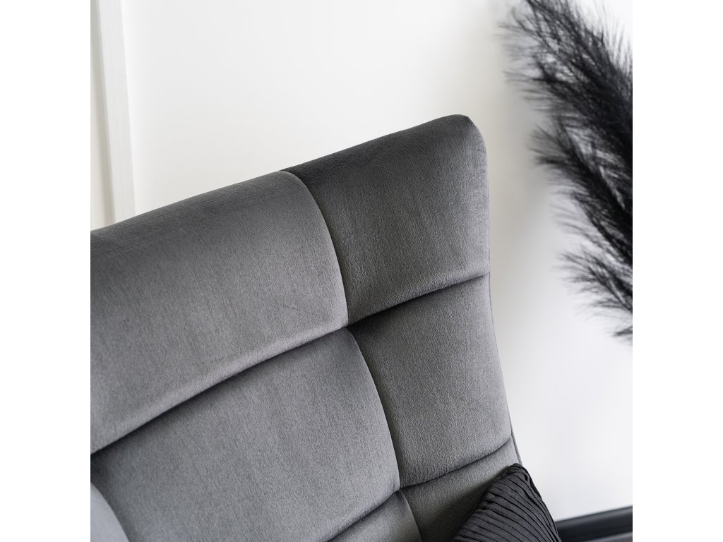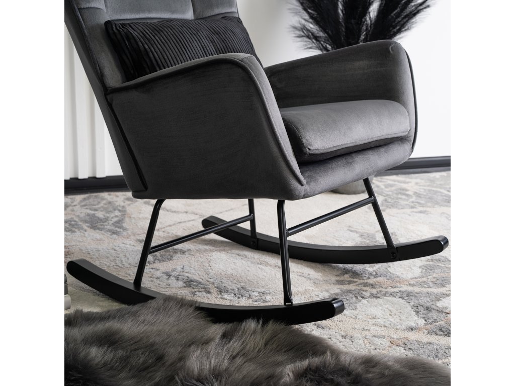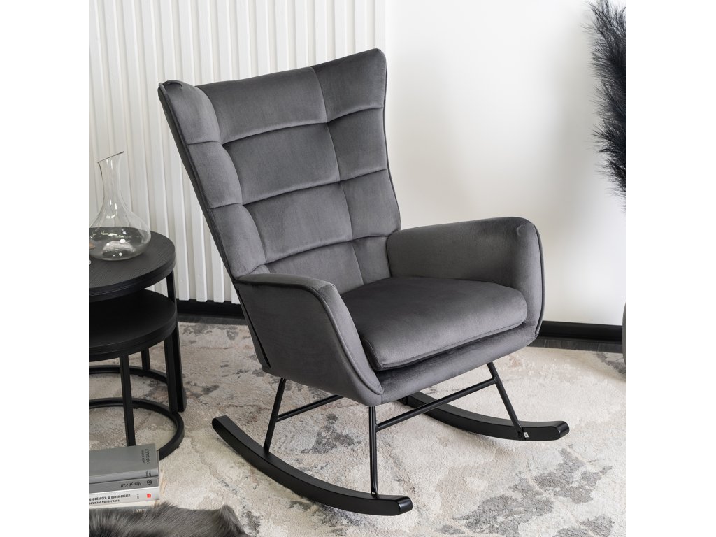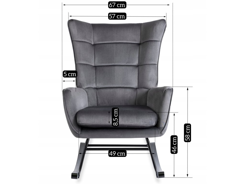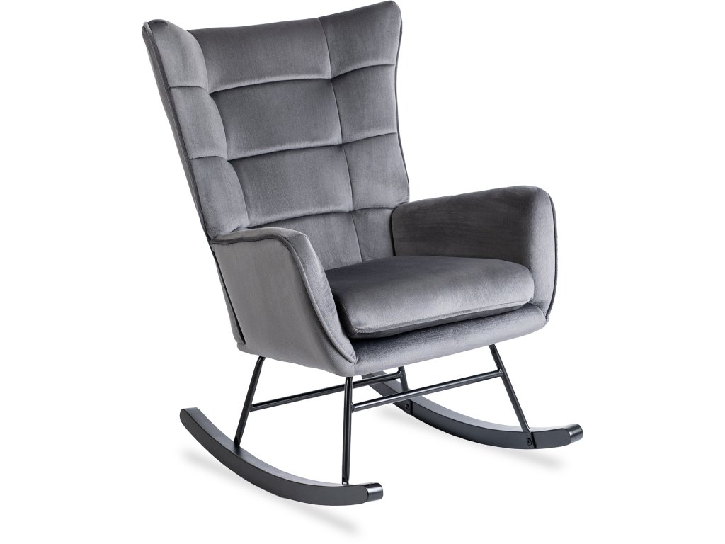 A szék masszív fém alapon áll, amelyhez fa sínek (úgynevezett csúszótalpak) kapcsolódnak, lehetővé téve a gyengéd hintázást. Bár nem rendelkezik hagyományos lábtartóval, egy praktikus keresztlécet tartalmaz, amely lábtámaszként szolgálhat – ideális esti olvasáshoz vagy filmnézéshez.