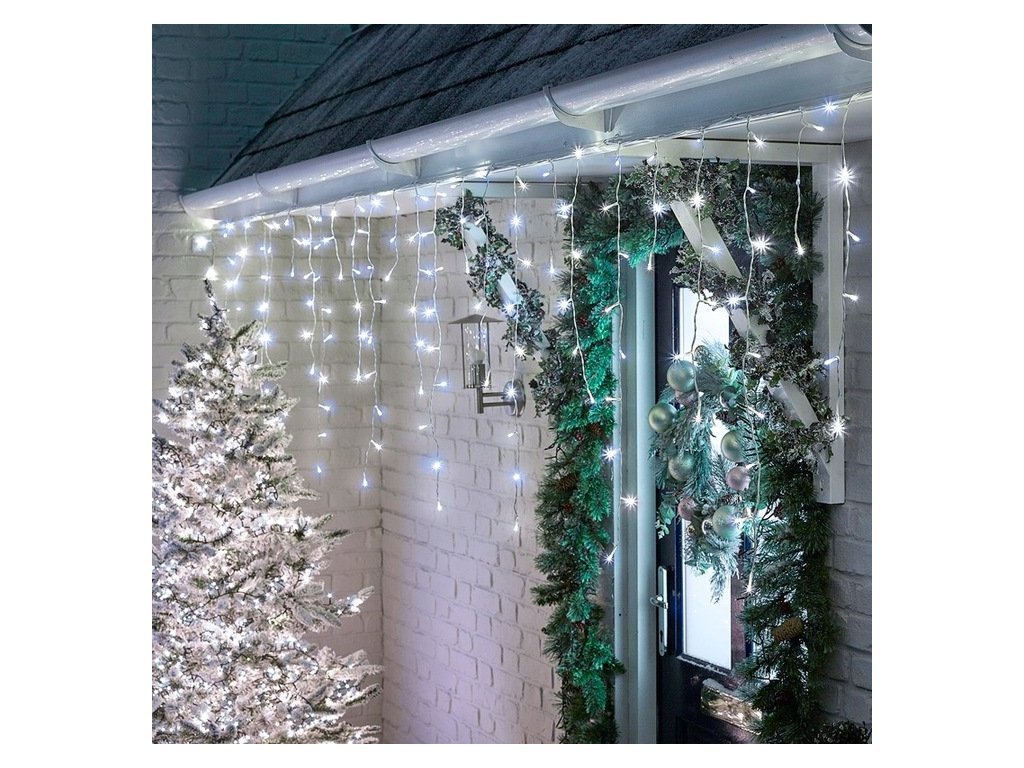 Karácsonyi fények, LED-ek száma: 300, jégcsapok száma: 60, szín: hidegfehér, több darab csatlakoztatható, vízállósági osztály: IP44, fényhossz: 12,8 m, tápkábel: 1,5 m, teljes hossz: 14,5 m, villanóeffektussal együtt.