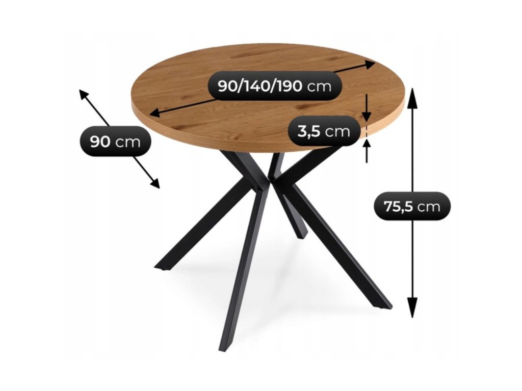 Az asztal magassága 75,5 cm, ami a kényelmes étkezéshez szükséges szabványos ergonómiai magasságnak felel meg. Alaphelyzetben 90 cm átmérőjű, amely elegendő helyet biztosít a mindennapi használathoz, kinyitva pedig tágas teret nyújt nagyobb összejövetelekhez vagy vendéglátáshoz. A méretek praktikus és rugalmas bútordarabbá teszik az asztalt bármely helyiségben.