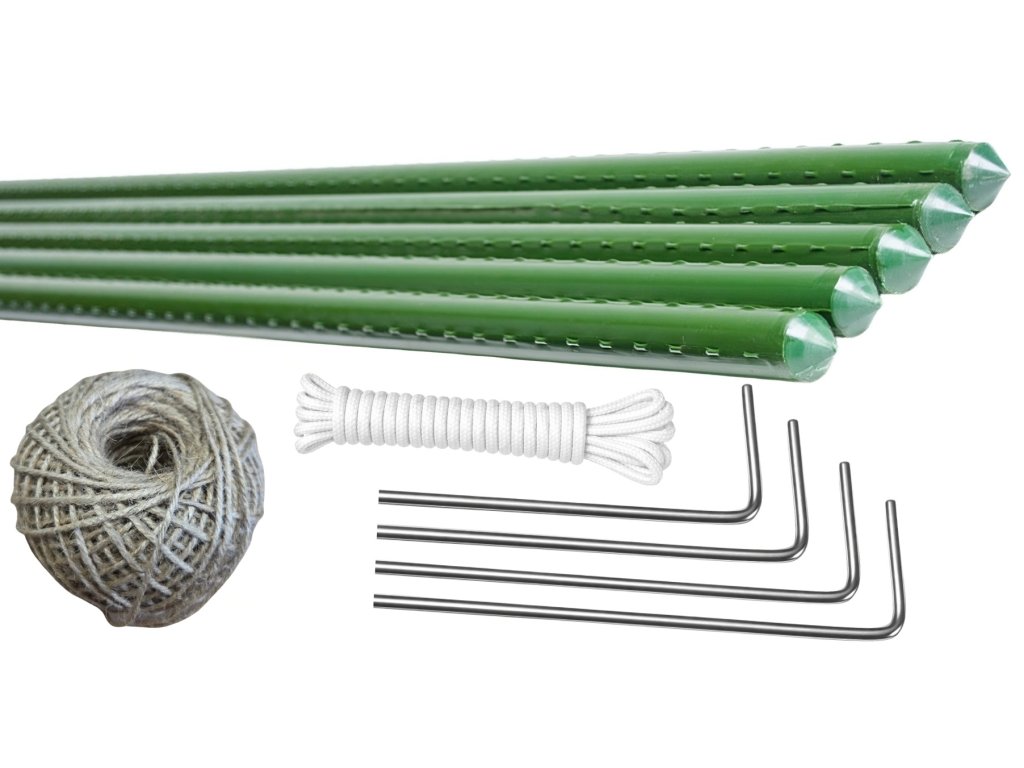 A kerti fóliasátor mellé ajándék rögzítőkészletet kap, amely tartalmazza a rögzítőcövekeket, köteleket és növénykötöző zsineget.
