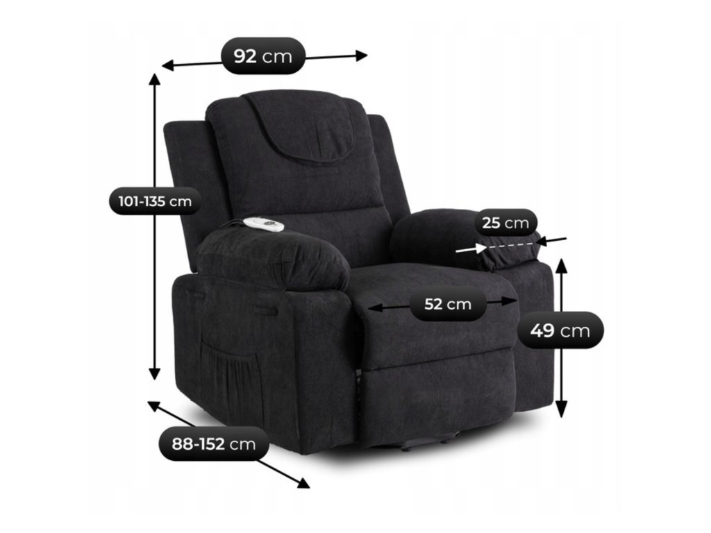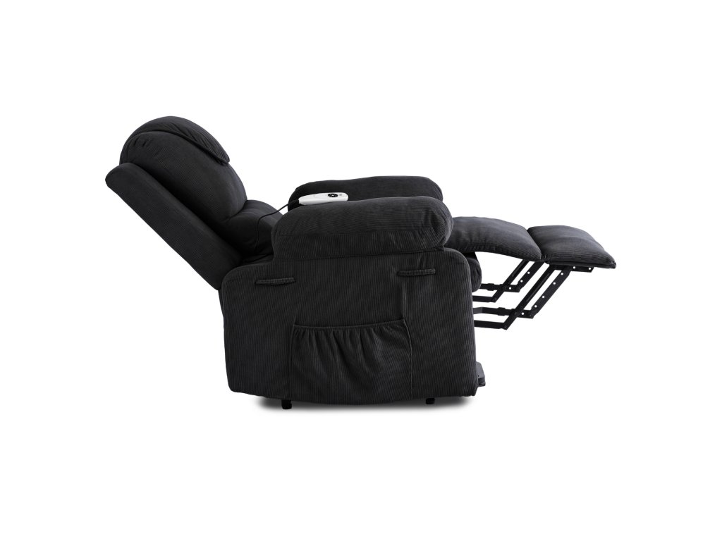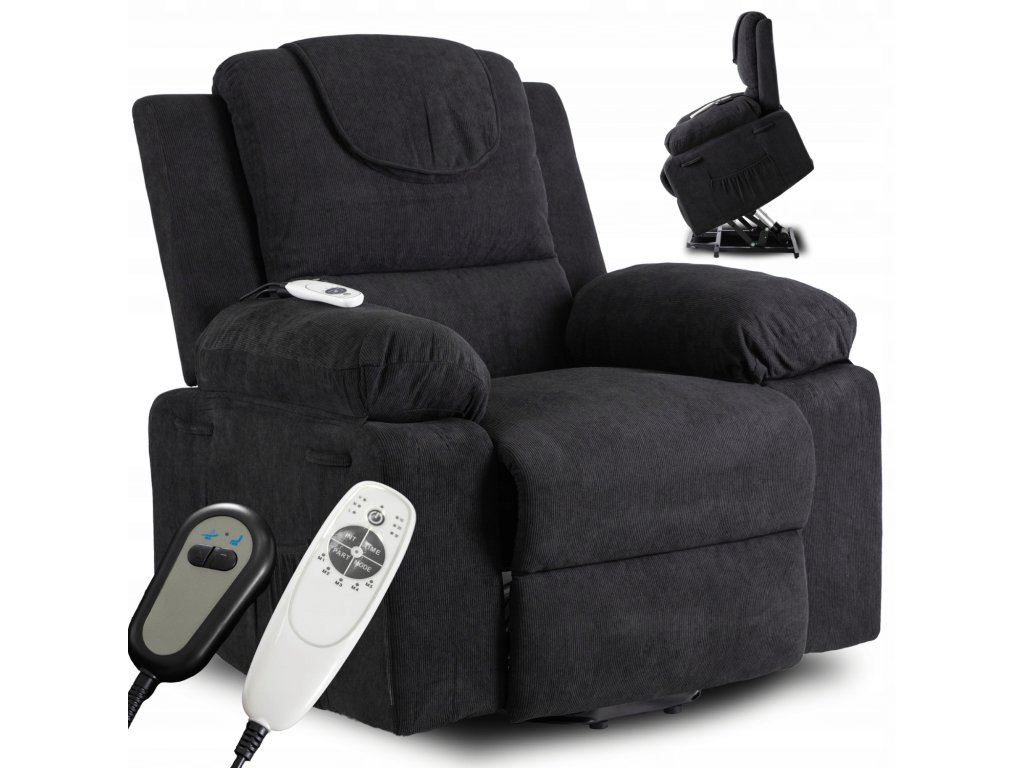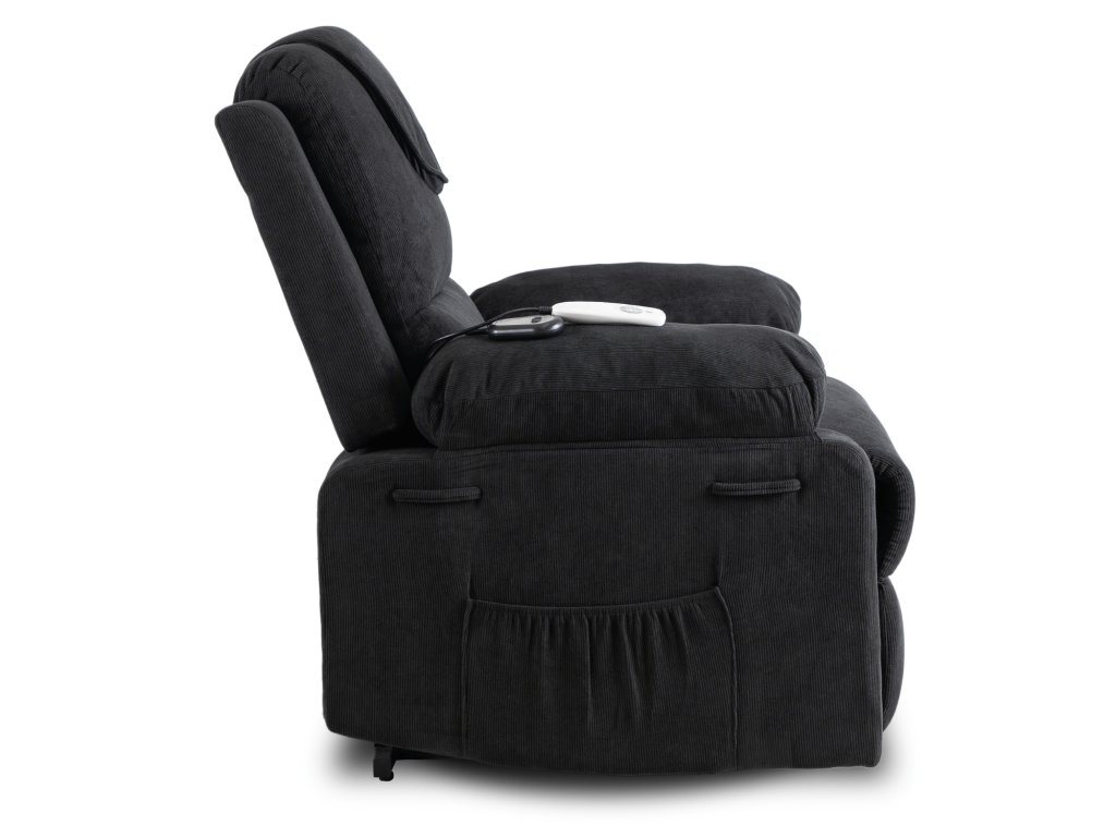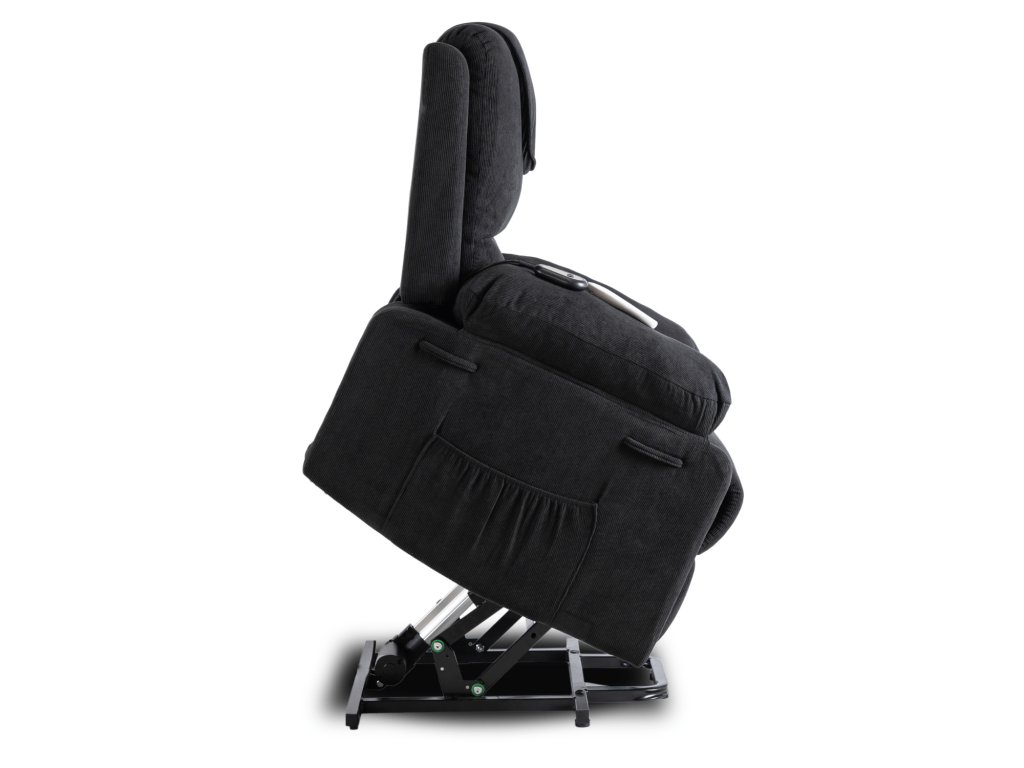 A felemelő mechanizmus finoman megemeli az egész fotelt, hogy a felállás egyszerű és biztonságos legyen, ideális időseknek vagy korlátozott mozgásképességű személyeknek. A praktikus oldalzsebben mindig kéznél tarthatja a távirányítót, könyvet vagy okostelefont.