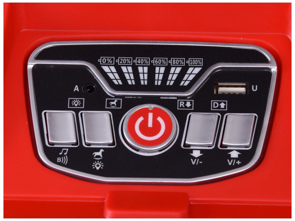A jármű multifunkcionális panellel van ellátva, amely tartalmaz gombokat a fények, a zene irányításához és egy egyedi hintázó üzemmódot, amely biztosítja, hogy a jármű finoman előre és hátra mozogjon. Az USB és MP3 bemenet lehetővé teszi gyermekének, hogy kedvenc zenéit hallgassa vezetés közben.