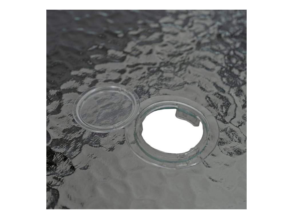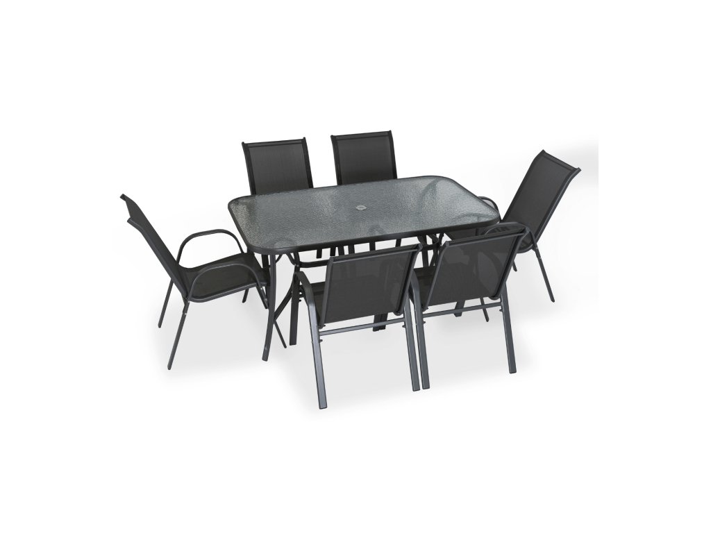 Az üveglapos asztal nemcsak elegáns, hanem rendkívül praktikus is. Az edzett üveg karcolásálló, könnyen tisztítható, és lekerekített szélei hozzájárulnak a nagyobb biztonsághoz, különösen ha gyermekek is vannak otthon. A napernyő számára előkészített nyílás is a részét képezi.