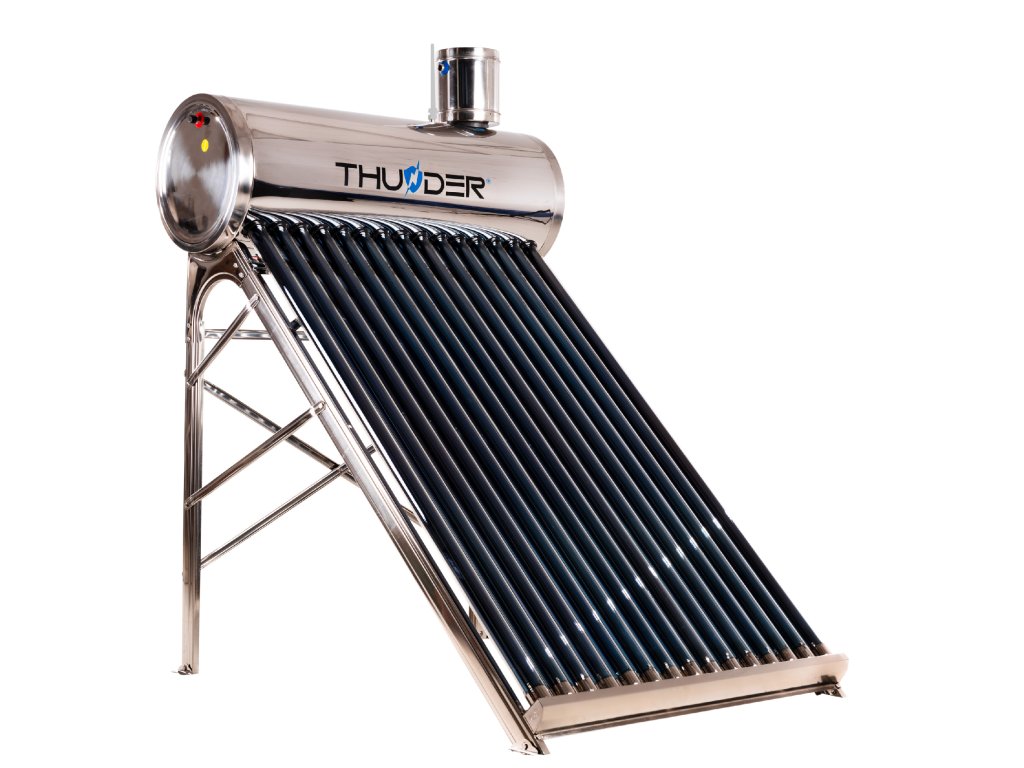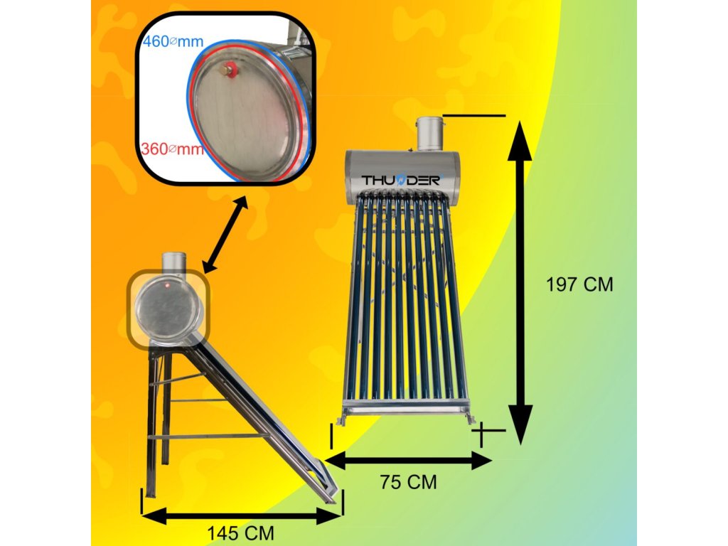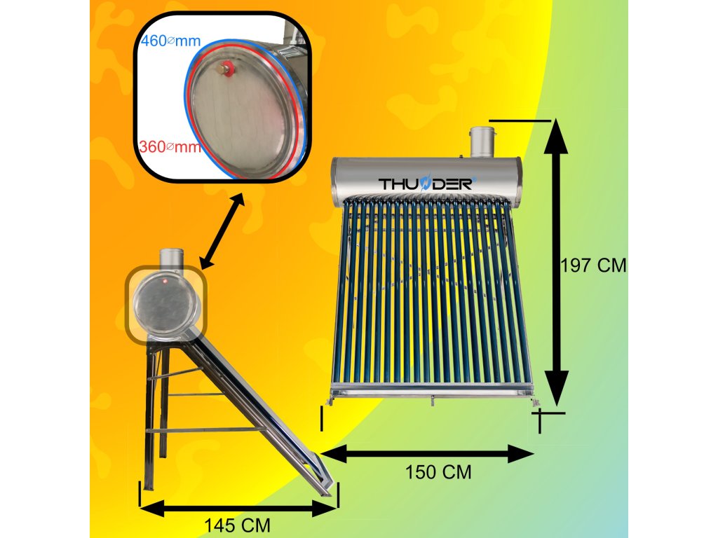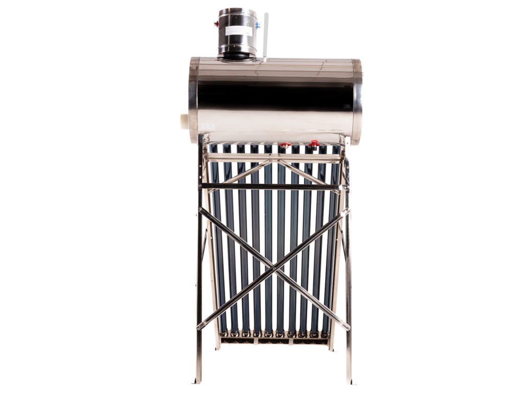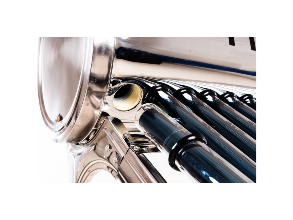 Nyomás nélküli napkolektor, tartály térfogata: 100 l, 150 l, 200 l, a vákuumcsövek száma 100 l: 10, a vákuumcsövek száma 150 l: 15, a vákuumcsövek száma 200 l: 20, cső szélessége: 58 mm, cső hossza: 1800 mm, anyag: rozsdamentes acél