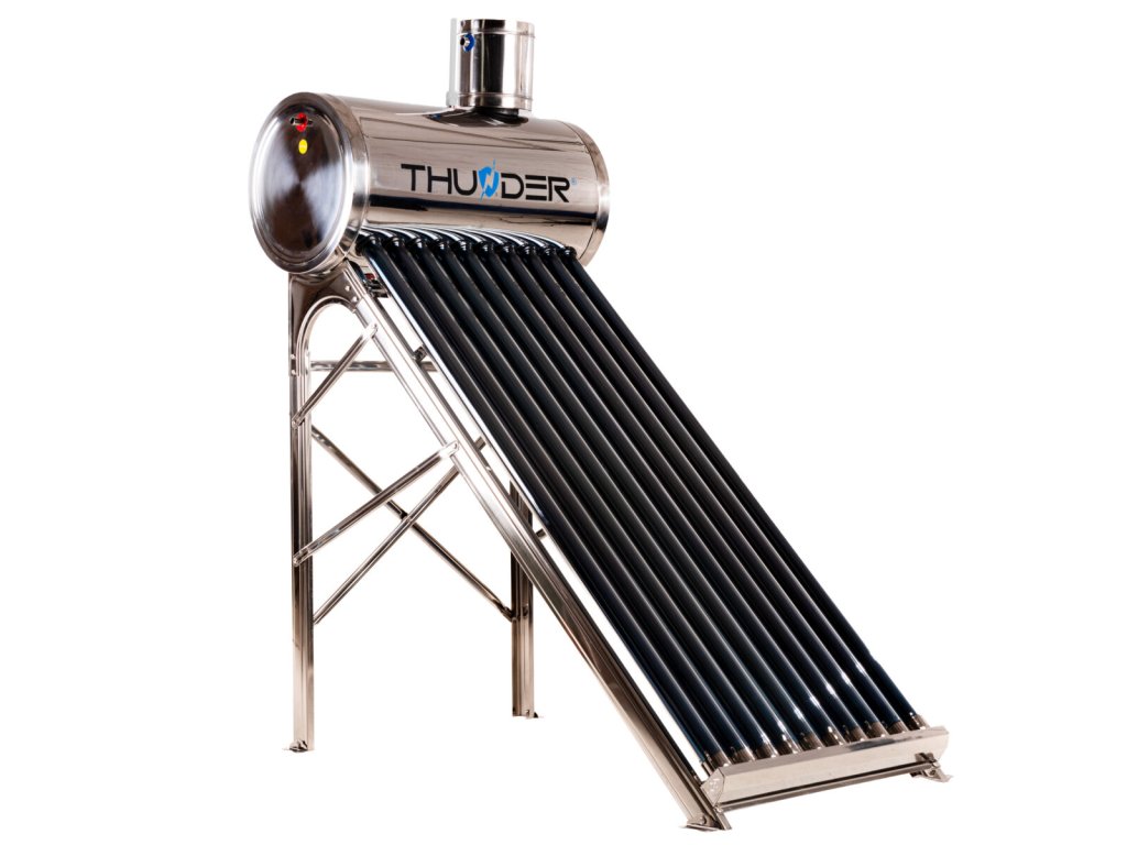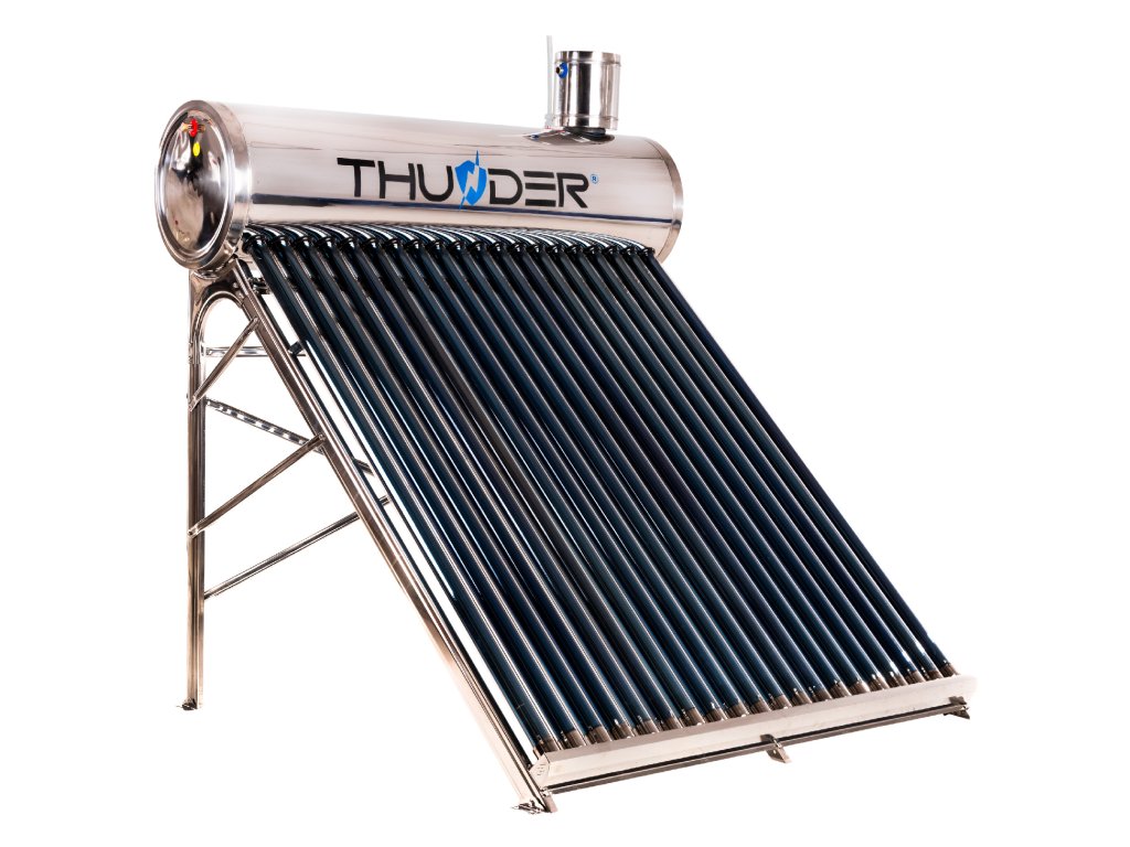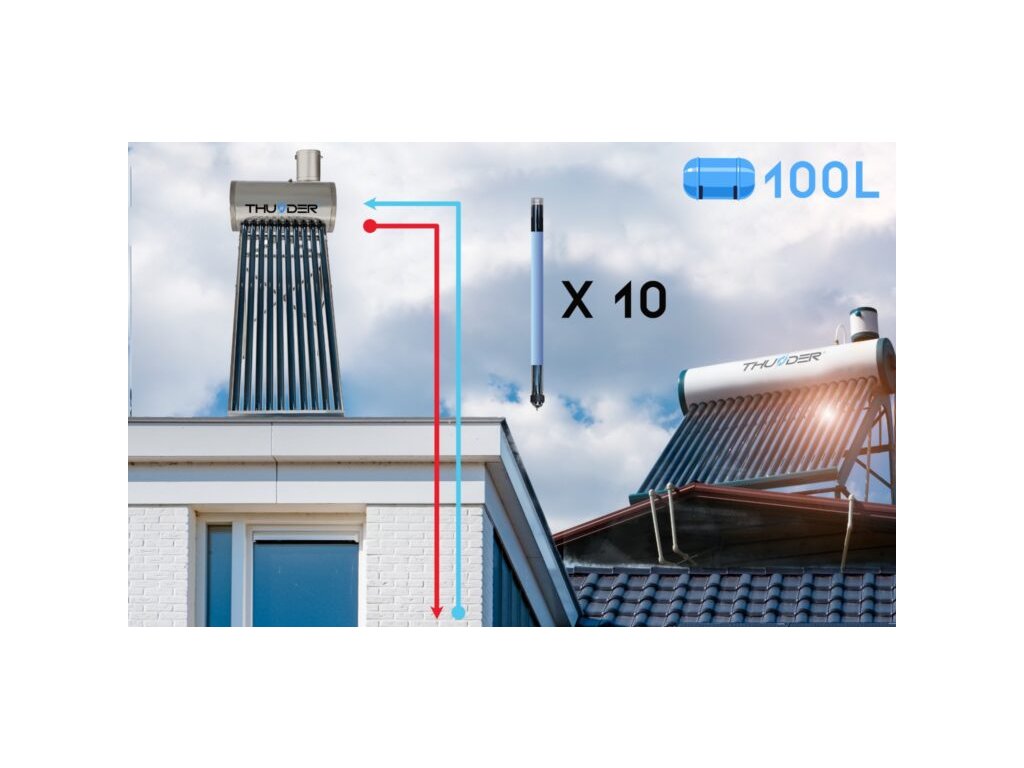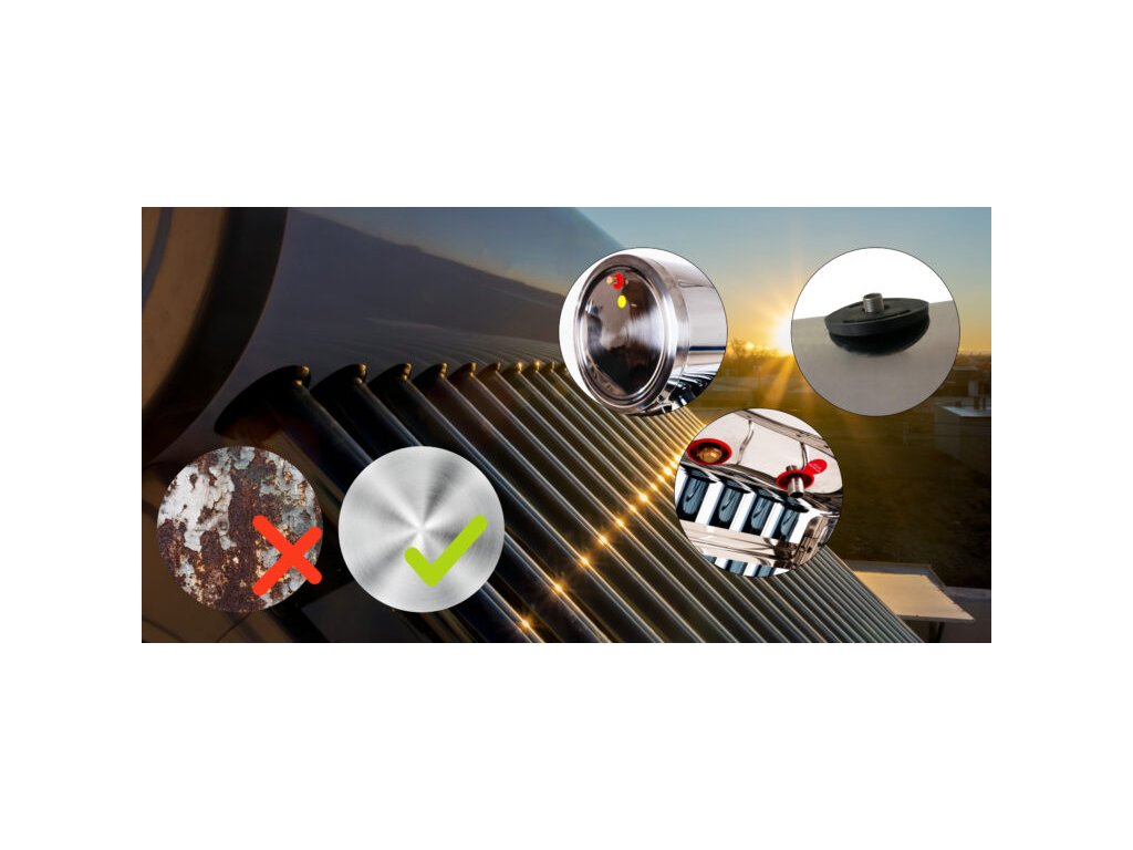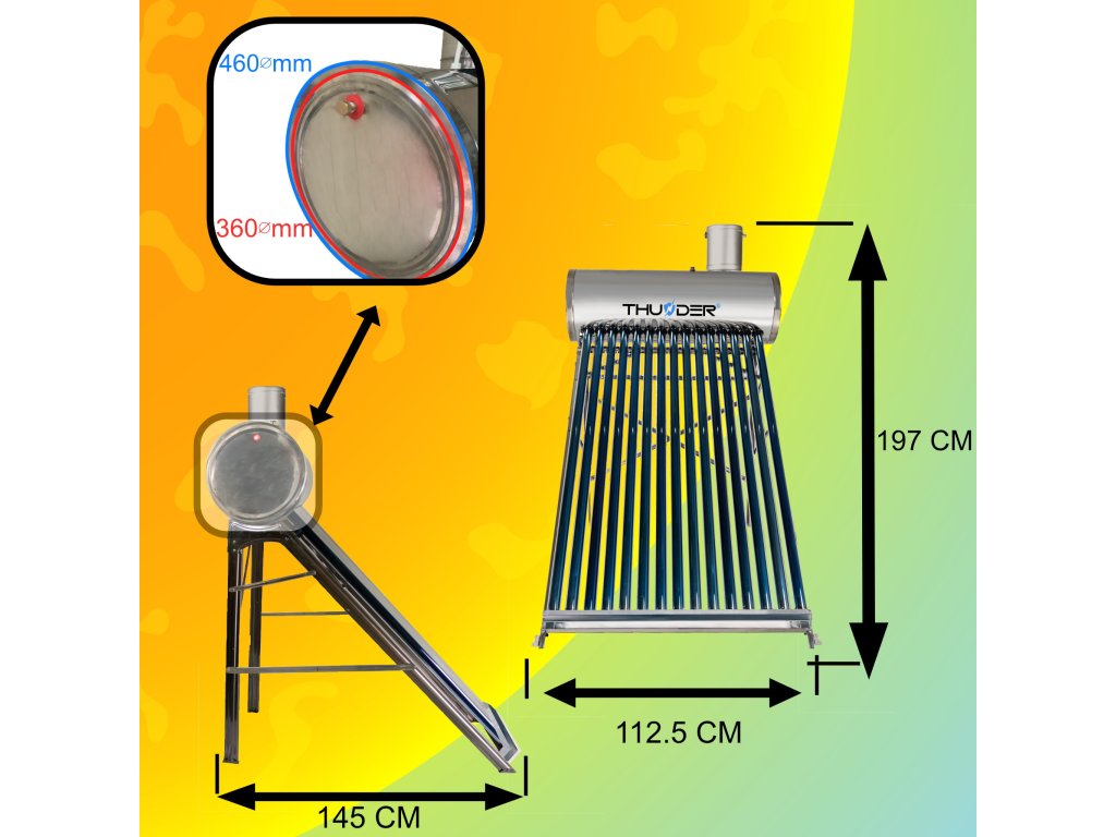 Nyomás nélküli napkolektor, tartály térfogata: 100 l, 150 l, 200 l, a vákuumcsövek száma 100 l: 10, a vákuumcsövek száma 150 l: 15, a vákuumcsövek száma 200 l: 20, cső szélessége: 58 mm, cső hossza: 1800 mm, anyag: rozsdamentes acél
