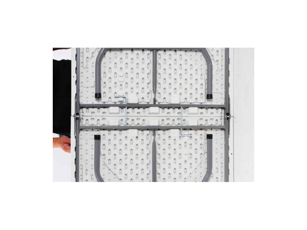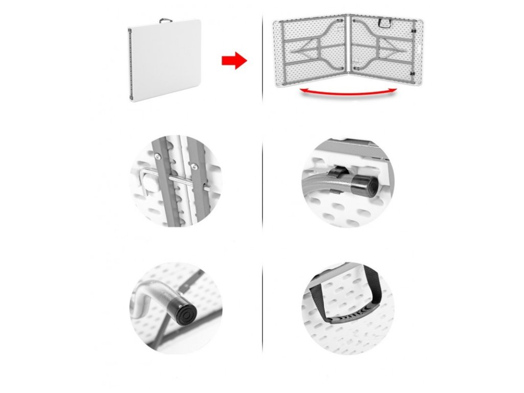 Catering összecsukható asztal, hossz: 180 cm, szélesség: 75 cm, anyag: acél és keményített műanyag, súly: 12,9 kg, csúszásgátló lábak, biztonsági zár, hordozófogantyú, szín: fehér