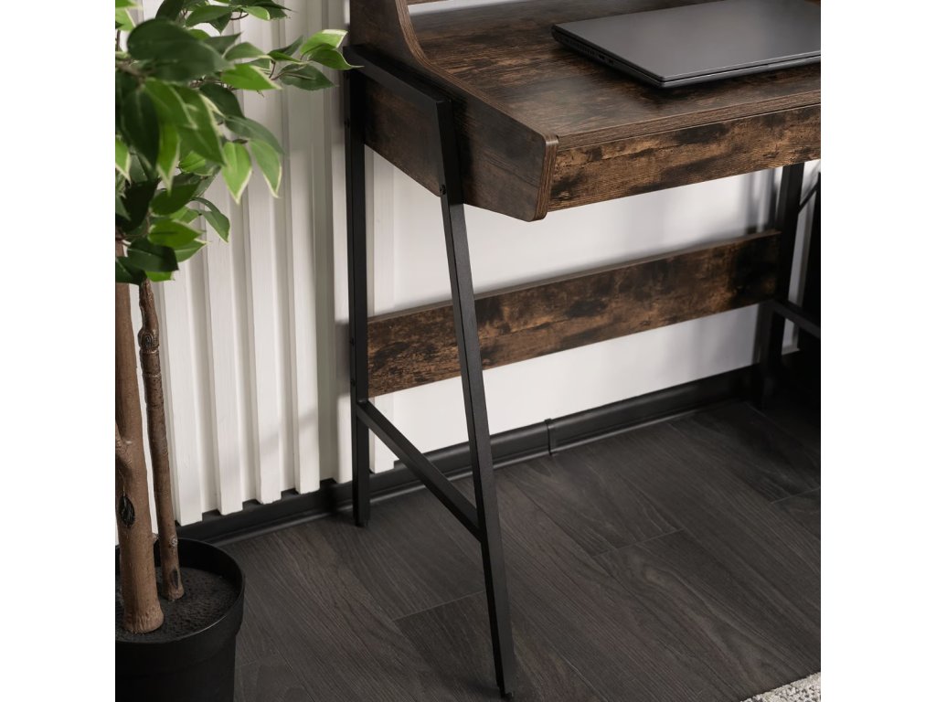 A fekete fém és a fa dekor kombinációjának köszönhetően az asztal tökéletesen illik a modern és ipari stílusú belső terekbe egyaránt. Emellett egy polccal is fel van szerelve, amely ideális dekorációk vagy irodai kiegészítők elhelyezésére.