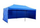 Ollós sátor profi, méretek: 3 x 6 m, súly: 47 kg, szín: kék, szerkezet: acél, lábak: 3 x 3 cm, falvastagság: 0,7 mm, fekete porfestett bevonat, 4 fokozatú magasságállítás (190-220 cm), 6 láb, tető: vízálló 820D (400 g/m²), gumi bevonatú poliészter, UV védelem, oldalfalak: vízálló 420D (230 g/m²), 3 db, poliuretán, tépőzáras rögzítés, felállítási rendszer: gyors, 1 személy számára 1 perc alatt, összecsukott sátor méretei: 148 x 34 x 20 cm, csomag tartalma: szerkezet, tető, 3 oldalfal, rögzítés, védő táska