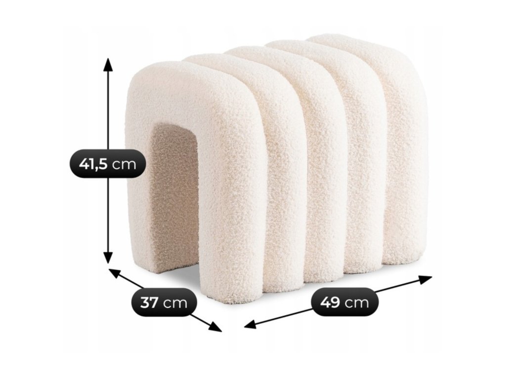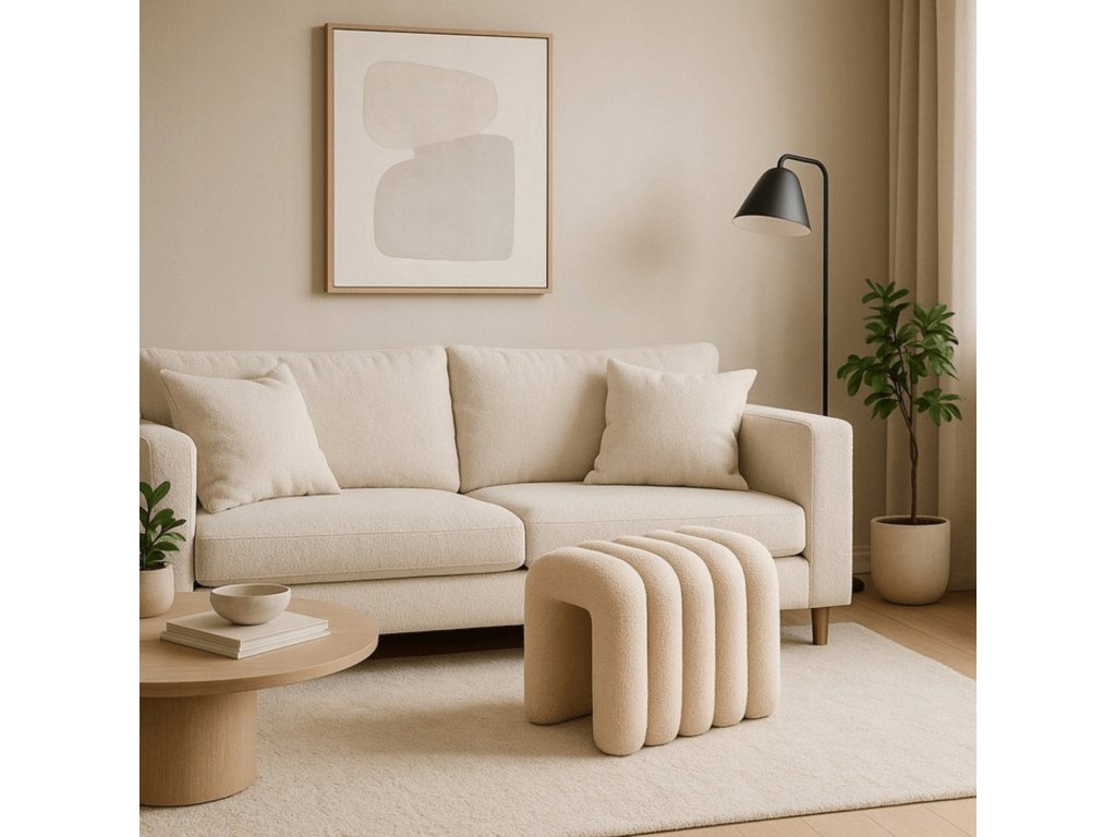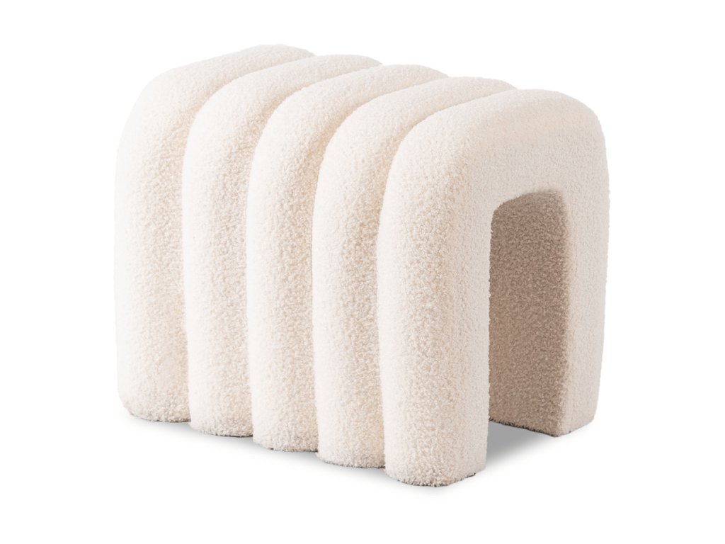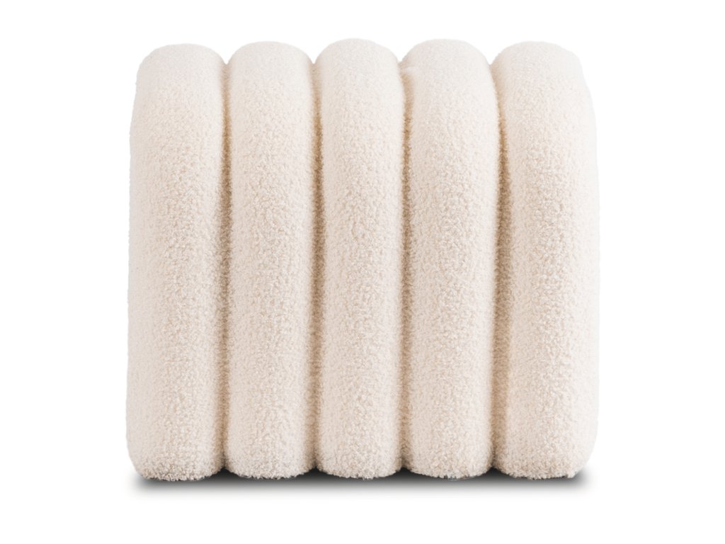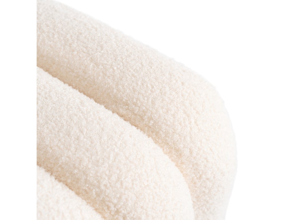 A puff puha, krémszínű bouclé anyaggal kárpitozott, kellemes tapintású és tartós. Az anyag struktúrája meleg és elegáns megjelenést kölcsönöz a felületnek.