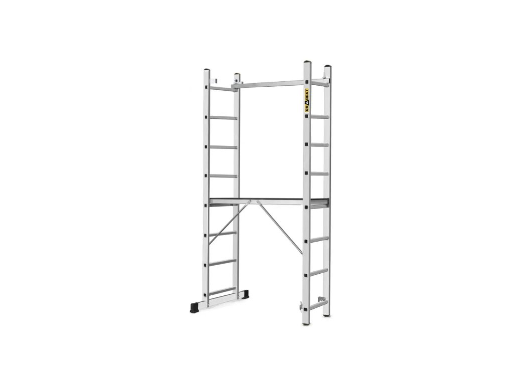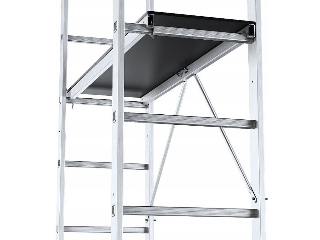A munkaplatform teljesen multifunkcionális. Ha állványzatra van szüksége, szerelje fel a munkaplatformot, és máris tökéletes eszköze van a magasban végzett hosszan tartó munkához. A mini állványzat a termék leggyakrabban használt funkciója. A tágas platform kényelmes és biztonságos munkavégzést tesz lehetővé. A platform fokról fokra állítható, és egyenetlen felületeken vagy lépcsőn is elhelyezhető. Ha létrára van szüksége, távolítsa el a platformot, és kétféle létrát állíthat össze: szabadon álló létrát és támasztólétrát.